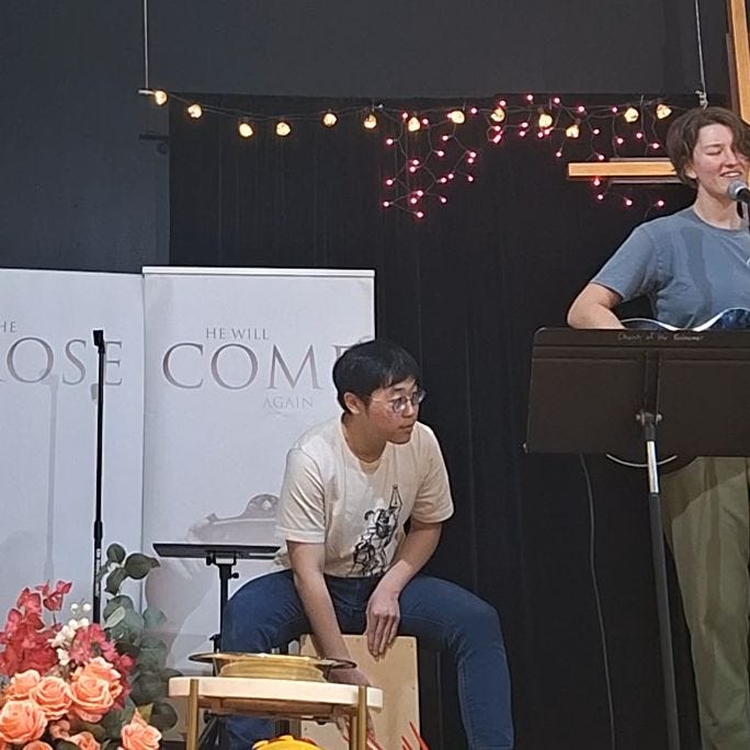 Anyway, the next step was to grab the cajon so that I could join Carolyn’s worship set.